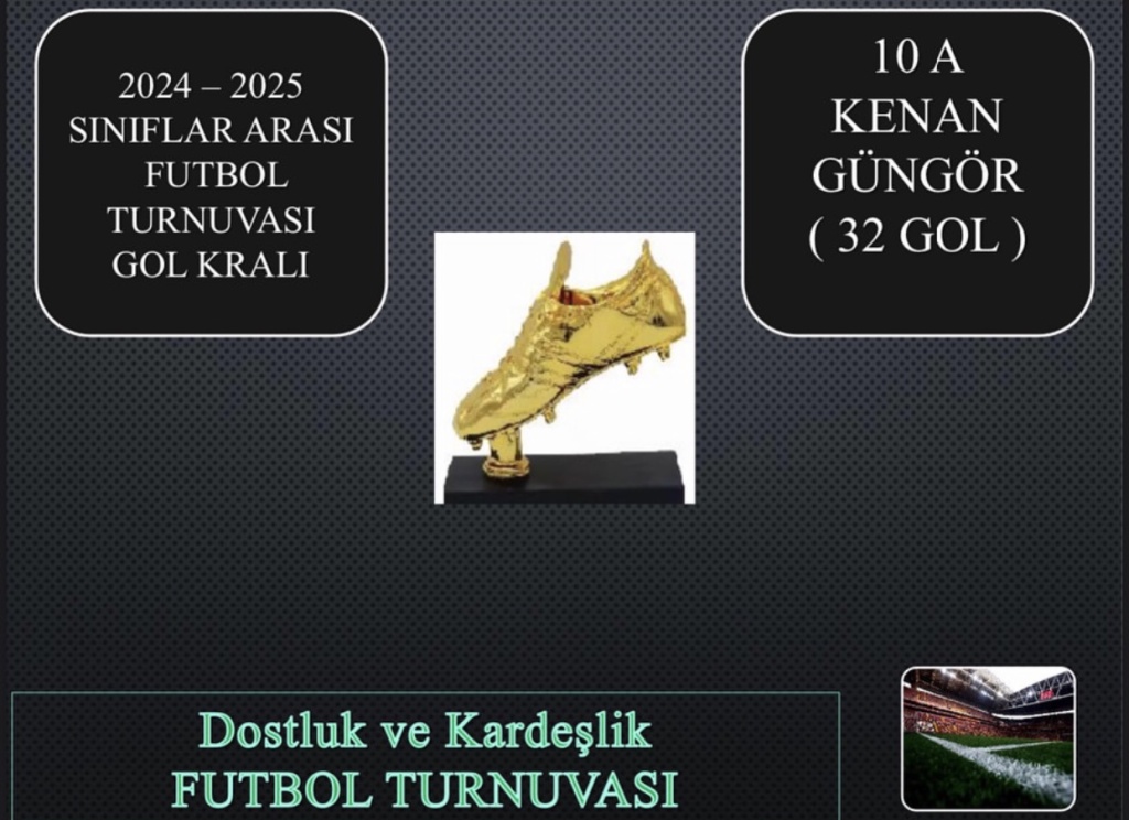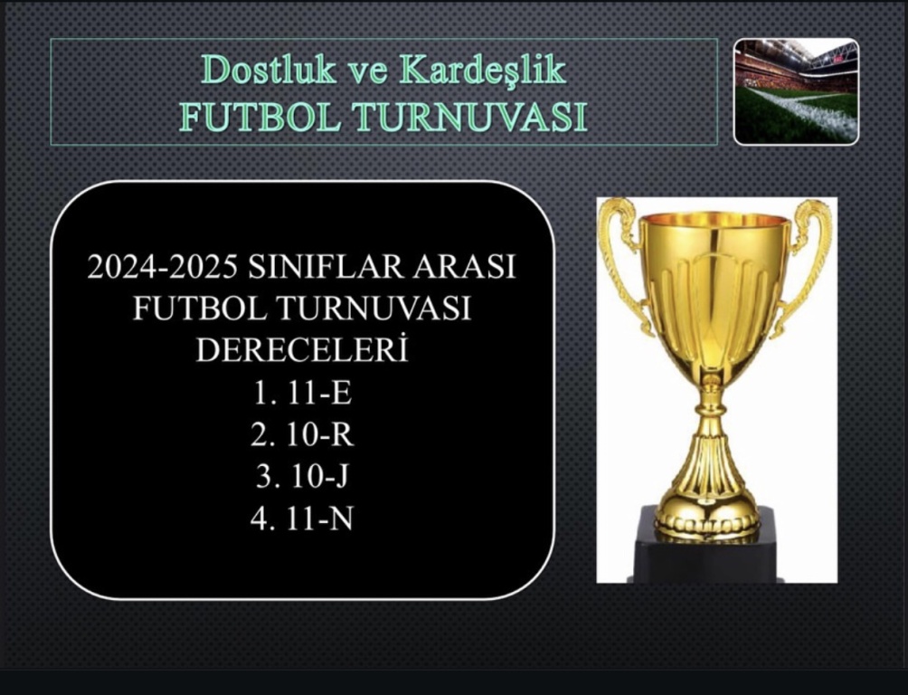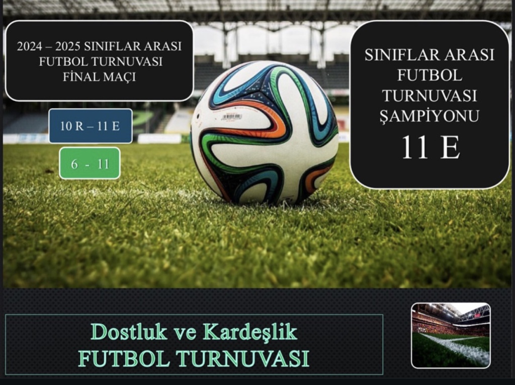 Okulumuzda yapılan futbol turnuvasına katılan tüm öğrencilerimizi tebrik ederiz. Turnuvamızın şampiyonu 11-E sınıfı olmuştur. Turnuvada 2. olan 10-R sınıfımızı ve şampiyon olan 11-E sınıfı öğrencilerimizi tebrik ederiz. Ayrıca turnuvanın yürütülmesinde büyük emekler veren Eren Coşkun, Caner Değirmen, Volkan Ayan, Savcı Topçu, Çağdaş Öztürk, Sezgin Ülkü , Doğukan Kan, Muhammed Saygılı, Enis Satici, Ferhat Genç öğretmenlerimize çok teşekkür ederiz.
